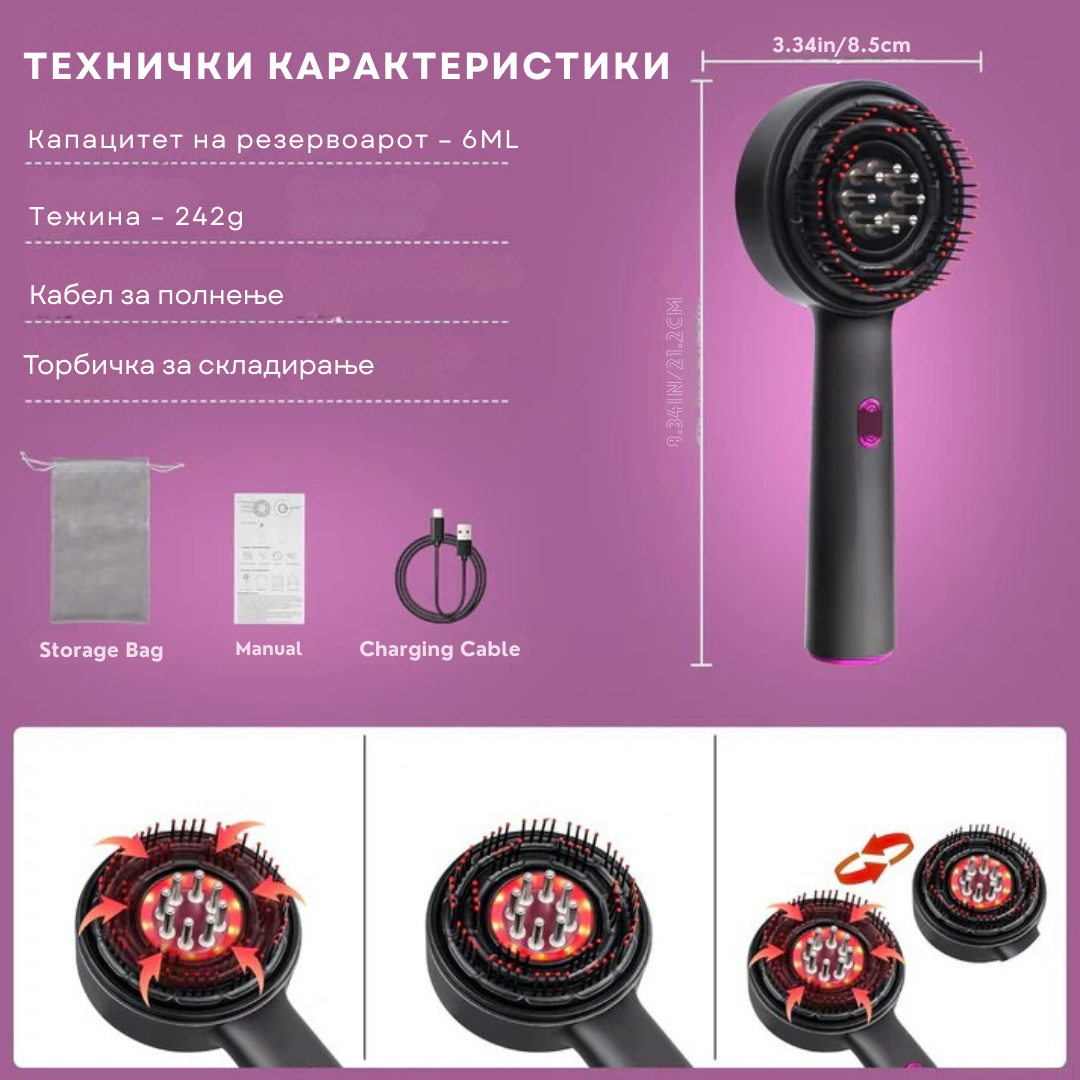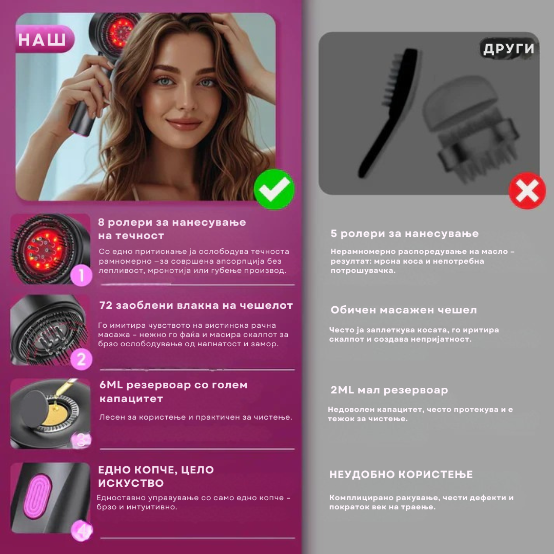 Да, можеш да користиш арганово, рицинусово, кокосово или било кое масло/серум за коса – уредот рамномерно го нанесува без мрсни раце.